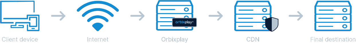 The second relay, operated by a third-party content provider, generates a temporary IP address, decrypts the name of the website you requested, and connects you to the site. This ensures that even OrbixPlay cannot see both who you are and what sites you are visiting.